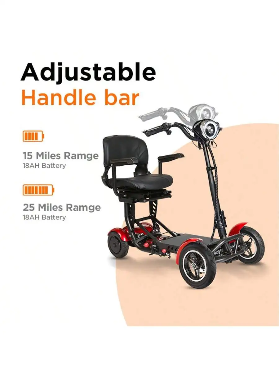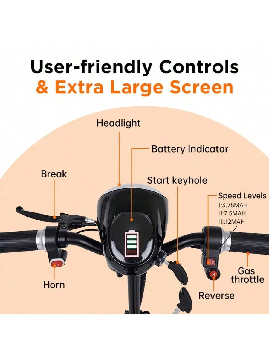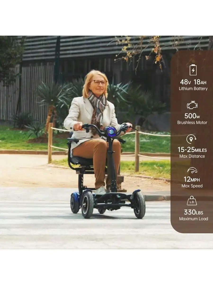 This 500W foldable four-wheel electric scooter is designed for safe and convenient mobility. With a top speed of 12 miles per hour, it offers a smooth ride for urban outings. The sturdy four-wheel design ensures stability and balance, perfect for elderly users. Its foldable frame makes storage and transport simple and hassle-free. A spacious front basket provides room for shopping, personal items, or daily essentials. Powered by a reliable 500W motor, it handles city streets and light all-terrain paths with ease. The scooter’s durable build ensures long-lasting use and dependable performance. Comfortable seating and ergonomic design allow for extended riding without fatigue. Easy-to-use controls make it beginner-friendly and practical for everyday use. Enjoy independence and comfort with this versatile electric mobility scooter.