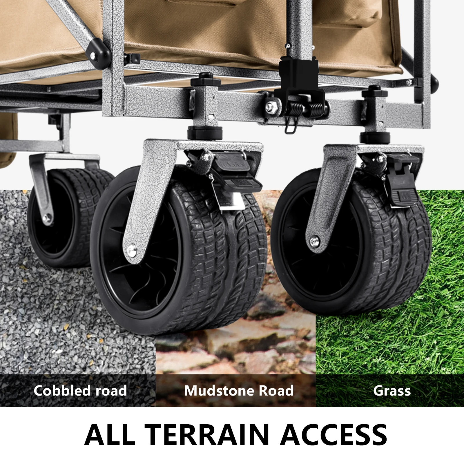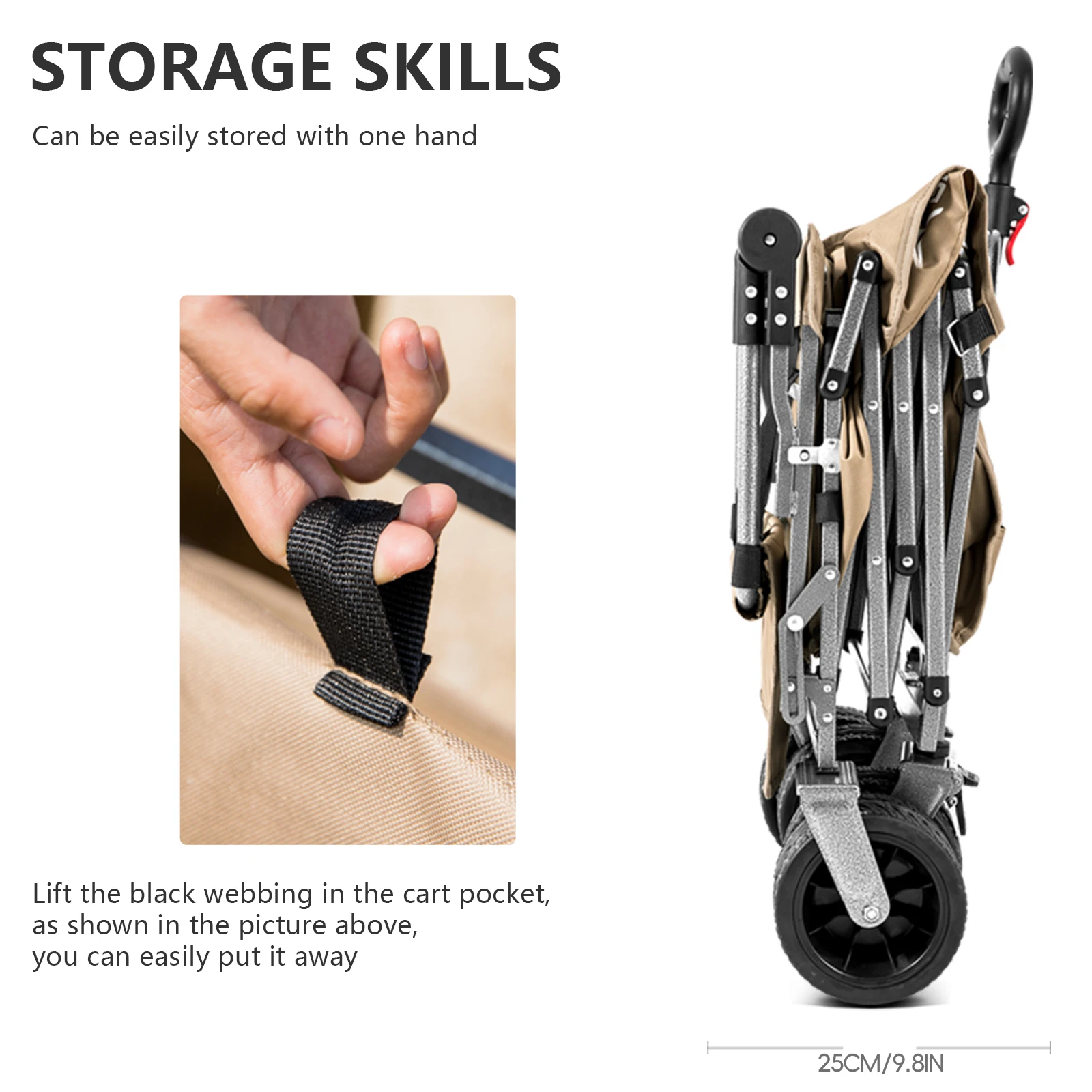 The BISINNA Camping Wagon Cart is a heavy-duty utility trolley designed for outdoor adventures and everyday use. With its large capacity, it easily carries camping gear, picnic supplies, or shopping items. The foldable design makes it convenient to store and transport when not in use. Built with durable materials, it can handle heavy loads with stability and reliability. Its collapsible structure ensures quick setup and hassle-free folding. The sturdy wheels roll smoothly across grass, sand, or pavement for versatile use. Perfect for camping trips, gardening, festivals, or beach outings, it saves time and effort. The ergonomic handle provides a comfortable grip for easy pulling. Despite its strong build, it remains lightweight and portable for travel. This multi-purpose wagon cart is the ideal solution for carrying essentials on outdoor adventures or daily tasks.