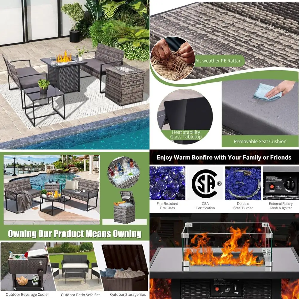 Transform your backyard into a stylish retreat with this outdoor patio furniture set featuring a gas fire pit. Designed for comfort and relaxation, the set creates a cozy conversation area for family and friends. The gas fire pit provides warmth and ambiance, making it perfect for cool evenings. Built with durable, weather-resistant materials, the furniture is designed to last through every season. Cushioned seating ensures comfort during long gatherings or quiet outdoor lounging. The included storage box keeps cushions, blankets, or accessories neatly organized. Modern design and neutral tones complement a variety of outdoor styles. Easy to assemble and maintain, this set is ideal for patios, gardens, or decks. Spacious seating accommodates multiple guests for entertaining or relaxing. Enjoy comfort, style, and functionality with this complete outdoor patio furniture set.